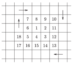C. 1287. Egy elég nagy négyzethálós lapra csigavonalban haladva felírjuk a pozitív egész számokat az ábra szerint. Melyik számok állnak a 2015 felett és alatt?