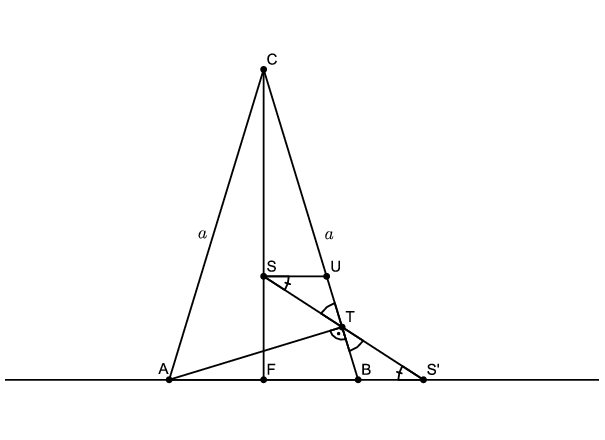Megoldás. Jelölje a háromszög szárát \(\displaystyle a\), súlypontját \(\displaystyle S\), az \(\displaystyle A\) csúcsból induló magasság talppontját \(\displaystyle T\), az \(\displaystyle AB\) oldal felezőpontját \(\displaystyle F\), az \(\displaystyle S\) pont tükörképét a \(\displaystyle T\) pontra \(\displaystyle S'\), végül az \(\displaystyle S\) ponton át az \(\displaystyle AB\) alappal húzott párhuzamos és \(\displaystyle BC\) metszéspontját \(\displaystyle U\).