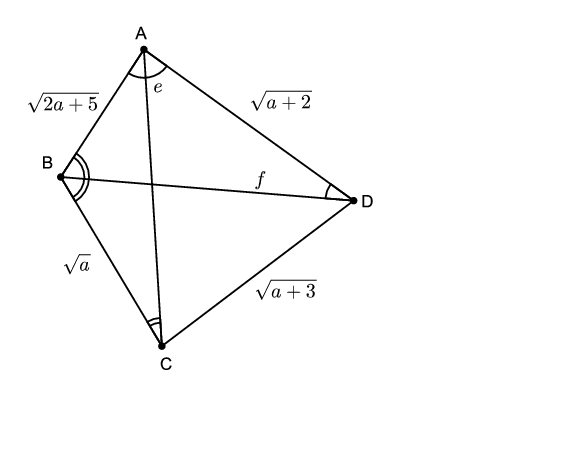 C. 1300. Egy konvex négyszög oldalainak hossza sorban \(\displaystyle \sqrt{a}\), \(\displaystyle \sqrt{a+3}\), \(\displaystyle \sqrt{a+2}\) és \(\displaystyle \sqrt{2a+5}\), mindkét átlója \(\displaystyle \sqrt{2a+5}\) hosszú. Határozzuk meg a négyszög legnagyobb szögét.