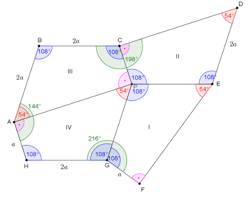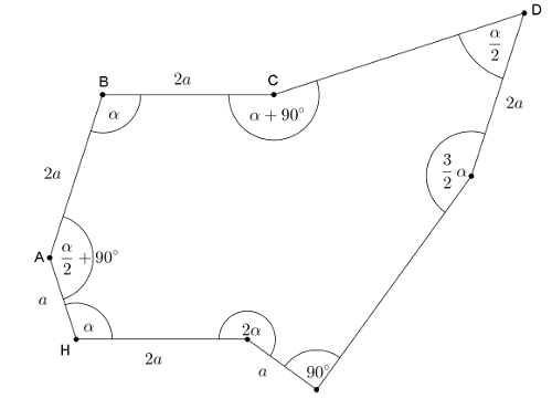 Ebből sejthető, hogy az ötszögek oldalai \(\displaystyle 2a\) hosszúak lesznek. Az \(\displaystyle A\) csúcsban \(\displaystyle \frac{\alpha } 2+90{}^{\circ}\) található, így ezt érdemes lehet úgy kettébontani, hogy egy \(\displaystyle \alpha /2\) nagyságú és egy \(\displaystyle 90{}^{\circ}\)-os szöget kapjunk. A \(\displaystyle C\) csúcsnál pedig egy \(\displaystyle \alpha \) és egy \(\displaystyle 90{}^{\circ}\) -os szögre érdemes bontani. Jelölje \(\displaystyle P\) az \(\displaystyle A\) csúcsban az \(\displaystyle AH\) oldalra állított merőleges és a \(\displaystyle C\) csúcsban a \(\displaystyle CD\) oldalra állított merőleges metszéspontját. Az \(\displaystyle APCB\) négyszöget tükrözve az \(\displaystyle AP\) oldalra egy szabályos ötszöget kapunk, hiszen négy oldala egyenlő és minden szöge \(\displaystyle 108^{\circ}\). Legyen \(\displaystyle \overline{AP}=b\).