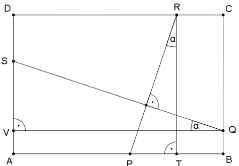 \(\displaystyle SQV\angle=α=PRT\angle\), mert merőleges szárú szögpárt alkotnak. Mivel \(\displaystyle AB=VQ=SQ\cdot\cos\alpha\) és \(\displaystyle BC=TR=PR\cdot\cos\alpha\), így: