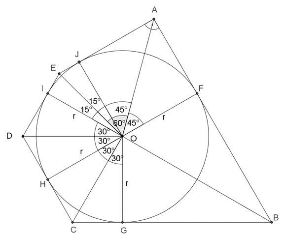 Megoldás. Az ábra jelölései szerint az érintési pontok legyenek \(\displaystyle F\), \(\displaystyle G\), \(\displaystyle H\), \(\displaystyle I\), \(\displaystyle J\), ahol a sugarak merőlegesek az oldalakra. Az A csúcsnál derékszög van, és \(\displaystyle OJ=OF=r\), így \(\displaystyle AFOJ\) négyzet, ezért \(\displaystyle JOF \angle=90^{\circ}\).