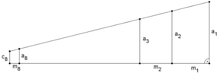 A magasságok mértani sorozatot alkotnak. A sorozat első tagja \(\displaystyle m_1\), hányadosa \(\displaystyle \lambda\), az első 8 tag összege: