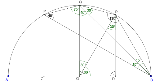 C. 1383. Az \(\displaystyle AB\) szakasz felezőpontja \(\displaystyle O\), az \(\displaystyle A\) ponthoz közelebbi negyedelőpontja \(\displaystyle C\), a \(\displaystyle B\) ponthoz közelebbi negyedelőpontja \(\displaystyle D\). A \(\displaystyle C\), \(\displaystyle O\) és \(\displaystyle D\) pontokban az \(\displaystyle AB\) szakaszra rajzolt merőlegesek az \(\displaystyle AB\) átmérőjű félkört rendre a \(\displaystyle P\), \(\displaystyle Q\), \(\displaystyle R\) pontokban metszik. Határozzuk meg a \(\displaystyle PQB\) és a \(\displaystyle QRB\) háromszögek szögeit.