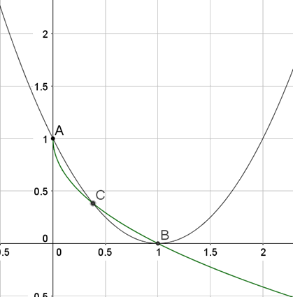 Így a megoldások: \(\displaystyle x_1=0\), \(\displaystyle x_2=1\), \(\displaystyle x_3=\frac{3-\sqrt5}{2}\). Tehát három közös pontja van a görbéknek: \(\displaystyle A(0;1)\), \(\displaystyle B(1;0)\) és \(\displaystyle C\left(\frac{3-\sqrt5}{2};\frac{3-\sqrt5}{2}\right)\), ugyanis