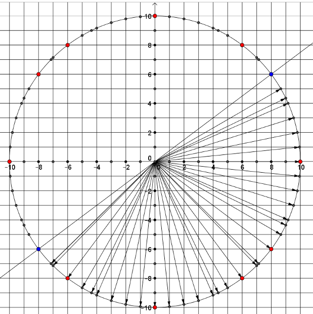 C. 1416. Hány olyan különböző, 10 egység hosszúságú síkbeli helyvektor van, amely \(\displaystyle x\) koordinátájának háromszorosa nagyobb \(\displaystyle y\) koordinátájának négyszeresénél, és legalább az egyik koordinátája egész?