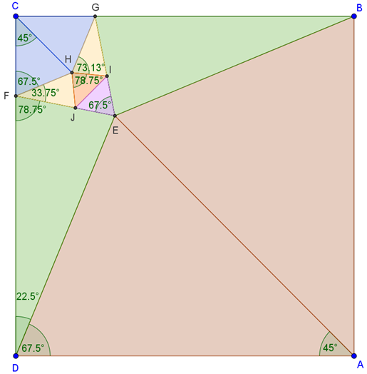 Már 8 darab háromszög megvan. A maradék kettőt úgy kapjuk, hogy összekötjük az \(\displaystyle I\) és \(\displaystyle J\) pontokat. A keletkező \(\displaystyle HIJ\) háromszög szögei: \(\displaystyle 360°-2\cdot67,5°-2\cdot73,125°=78,75°\) és \(\displaystyle \frac{180°-78,75°}{2}=50,625°\). Az \(\displaystyle EIJ\) háromszög szögei pedig: \(\displaystyle 360°-2\cdot67,5°-2\cdot78,75°=67,5°\) és \(\displaystyle \frac{180°-67,5°}{2}=56,25°\).