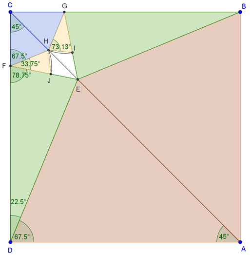 Az \(\displaystyle F\) és \(\displaystyle G\) pontokból \(\displaystyle FH\) sugárral körözve a körök az \(\displaystyle FE\) és \(\displaystyle GE\) szakaszokból kimetszik az \(\displaystyle I\) és \(\displaystyle J\) pontokat. A keletkező \(\displaystyle FHJ\) és \(\displaystyle GHI\) egybevágó, egyenlő szárú háromszögek szögei \(\displaystyle 180°-67,5°-78,75°=33,75°\) és \(\displaystyle \frac{180°-33,75°}{2}=73,125°\).