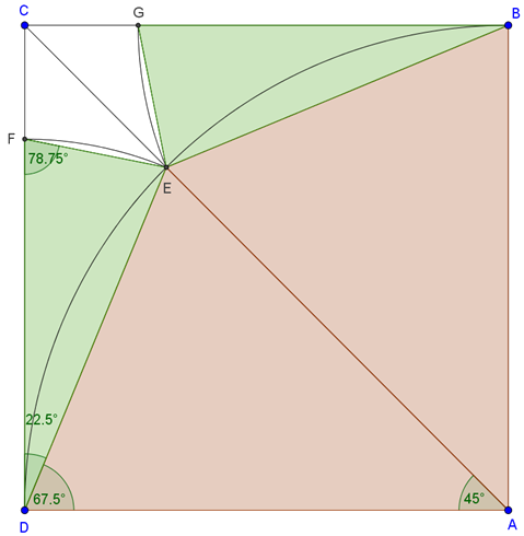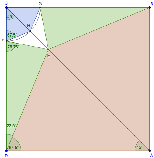A \(\displaystyle B\) és \(\displaystyle D\) pontokból \(\displaystyle BE\) sugárral körözve a körök a négyzet oldalaiból kimetszik az \(\displaystyle F\) és \(\displaystyle G\) pontokat. A keletkező \(\displaystyle BEG\) és \(\displaystyle DEF\) egybevágó, egyenlő szárú háromszögek szögei \(\displaystyle 90°-67,5°=22,5°\) és \(\displaystyle \frac{180°-22,5°}{2}=78,75°\). Az \(\displaystyle C\) csúcsból \(\displaystyle CF\) sugárral körözve, a kör az \(\displaystyle AC\) átlóból kimetszi a \(\displaystyle H\) pontot. Az így keletkező \(\displaystyle CFH\) és \(\displaystyle CGH\) egybevágó, egyenlő szárú háromszögek szögei \(\displaystyle 45°\) és \(\displaystyle \frac{180°-45°}{2}=67,5°\).