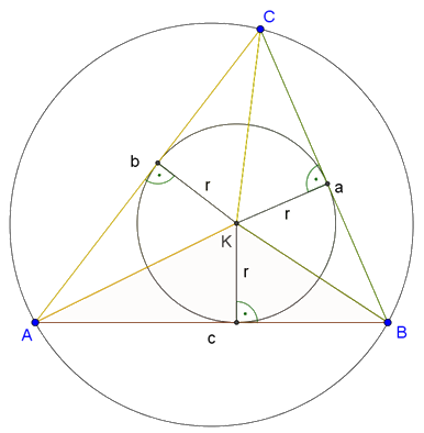 A háromszög beírt körének középpontját a csúcsokkal összekötve három részháromszöget kapunk (2. ábra). Ezek területének összege a háromszög területe: