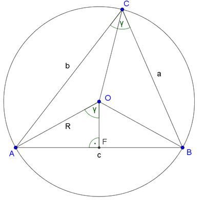 Használjuk az 1. ábra jelöléseit. Az \(\displaystyle AFO\) derékszögű háromszögben \(\displaystyle \frac c2=R\cdot\sin γ\), vagyis \(\displaystyle \sin γ=\frac{c}{2R}\). Ezt behelyettesítve a háromszög területképletébe: