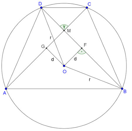 A trapéz átlói a körben húrok. A húr felező merőlegese átmegy a középponton. Legyen a \(\displaystyle BD\) átló felezőpontja az \(\displaystyle F\) pont. A Pitagorasz-tételt használva a \(\displaystyle BFO\) derékszögű háromszögben: