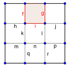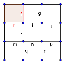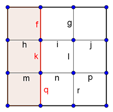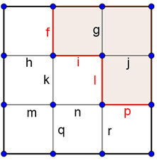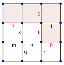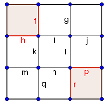 Megoldás. Nevezzük 2-es eseteknek azokat, amikor már két rácsszakasz megjelölésével két részre bontjuk a négyzetet. Ezt az \(\displaystyle f,h\), vagy a \(\displaystyle g,j\), vagy az \(\displaystyle m,q\), vagy a \(\displaystyle p,r\), sarkoknál lévő szakaszpárok kiválasztásával, vagyis 4-féleképpen tudjuk megtenni.