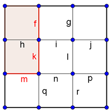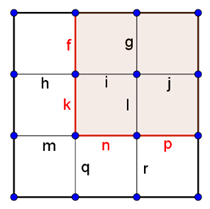 Az \(\displaystyle f,k,n,p\) rácsszakaszok kiválasztásával. A forgási szimmetriát figyelembe véve ebből 4 eset van.