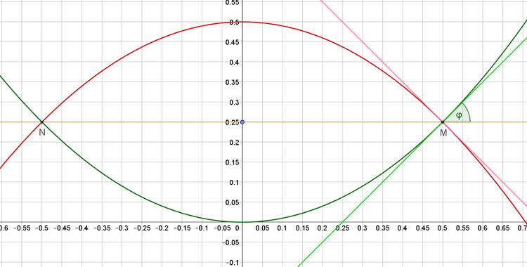 Ha meghatározzuk az \(\displaystyle M\) pontban az \(\displaystyle y=x^2\) parabola érintőjének \(\displaystyle φ\) irányszögét, akkor a szimmetria miatt az érintők által bezárt szög az \(\displaystyle M\) és \(\displaystyle N\) pontban is \(\displaystyle 2φ\) lesz.
