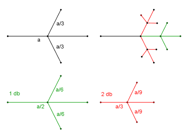 Minden, az előző másodperc végén létező ágból létrejön egy feleakkora és két harmad akkora ág. Tehát, amikor a végződések hossza feleződik, akkor egy ág keletkezik, amikor harmadolódik, akkor pedig kettő.