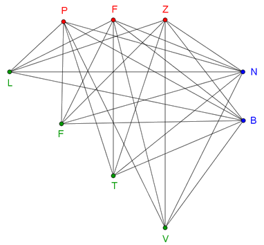 Megoldás. Szemléltessük a lehetséges kártyalapokat egy \(\displaystyle 9\) pontú gráffal, ahol a pontok a kártyán szereplő dolgok (színek, elemek, szereplők), a lehetséges kártyák pedig az élek (1. ábra). A szabályokat figyelembe véve a gráfnak \(\displaystyle 3\cdot4+3\cdot2+4\cdot2=26\) éle van.