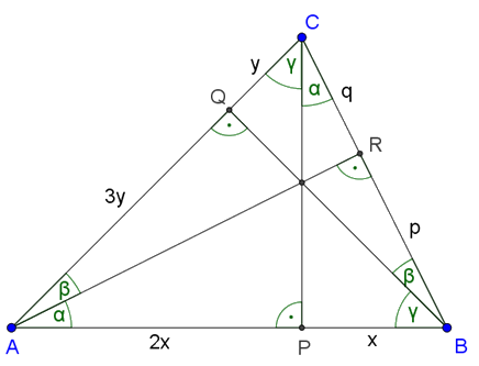 A megadott osztásarányoknak megfelelően legyen \(\displaystyle AP=2x\), \(\displaystyle PB=x\), \(\displaystyle AQ=3y\), \(\displaystyle QC=y\) és legyen \(\displaystyle BR=p\), illetve \(\displaystyle RC=q\).