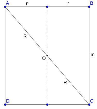 Az \(\displaystyle ABC\) derékszögű háromszögben \(\displaystyle AB=2r\), \(\displaystyle BC=m\) és \(\displaystyle AC=2R\). Tudjuk, hogy \(\displaystyle R=1\). Írjuk fel a Pitagorasz-tételt az \(\displaystyle ABC\) háromszögben: