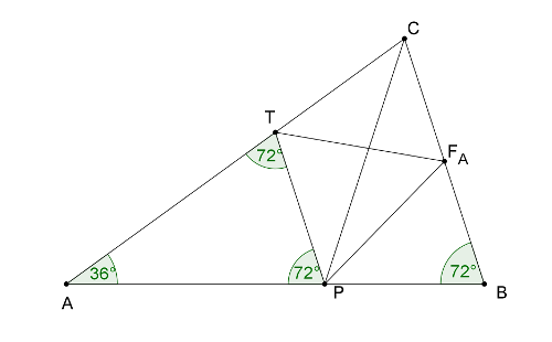 Mivel \(\displaystyle 180^{\circ}=CQT∡+TQP∡+PQB∡=\delta+TQP∡+\varepsilon\), ezért \(\displaystyle TQP∡=72^{\circ}\). Ebből pedig már adódik, hogy \(\displaystyle PTQ∡=\delta\). Ebből látszólag az következik, hogy \(\displaystyle PT=QT\) csak akkor teljesül, ha \(\displaystyle \varepsilon=72^{\circ}\) és \(\displaystyle \delta=36^{\circ}\), bármely más szög esetén az állítás nem igaz. Azonban, ha megpróbálunk ellenpéldát szerkeszteni, nem jutunk eredményre: bármilyen szöget is választunk \(\displaystyle \delta\)-nak, azt \(\displaystyle P\) pontból felmérve, majd az így kapott \(\displaystyle Q\) pontból ismét felmérve, a kapott szögszár nem a \(\displaystyle T\) pontban metszi az \(\displaystyle AC\) egyenest. Ez nem véletlen. Ugyanis \(\displaystyle TQP\angle=72^{\circ}\), vagyis olyan pontot kellene találnunk a \(\displaystyle BC\) szakaszon, amelyből a \(\displaystyle PT\) szakasz \(\displaystyle 72^{\circ}\)-os szög alatt látszik. A legnagyobb szög alatt a \(\displaystyle BC\) szakasz \(\displaystyle F_A\) felezőpontjából látszik a \(\displaystyle PT\) szakasz (ilyenkor a látószögkörív érinti a \(\displaystyle BC\) oldalt). Megmutatjuk, hogy \(\displaystyle TF_AP\angle<72^{\circ}\).