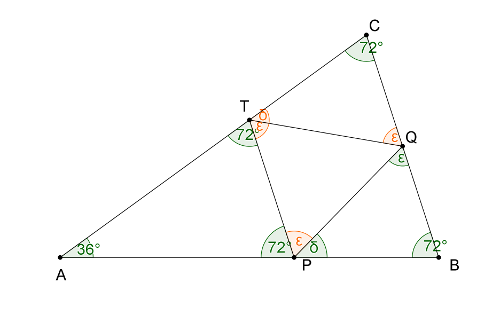 Megoldás. Ellenpéldával igazoljuk, hogy az állítás nem igaz. Legyen az \(\displaystyle ABC\) háromszögben \(\displaystyle AB=AC\), és \(\displaystyle BAC\angle=36^{\circ}\). A \(\displaystyle C\)-ből induló belső szögfelező messe az \(\displaystyle AB\) oldalt a \(\displaystyle P\) pontban. Húzzunk \(\displaystyle P\)-n keresztül párhuzamost \(\displaystyle BC\)-vel, ez messe az \(\displaystyle AC\) szárat \(\displaystyle T\)-ben, továbbá a \(\displaystyle BC\) oldal felezőpontja legyen \(\displaystyle Q\). Megmutatjuk, hogy ebben az esetben a feladat minden feltétele teljesül, de \(\displaystyle PT\) nem egyenlő \(\displaystyle QT\)-vel.