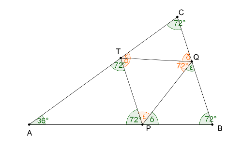 Először igazoljuk, hogy a feladat feltételei teljesülnek. Mivel \(\displaystyle PT|| BC\), ezért az \(\displaystyle APT\) háromszög szögei is \(\displaystyle 36\), \(\displaystyle 72\), \(\displaystyle 72\) fokosak. Mivel \(\displaystyle CP\) szögfelező, így \(\displaystyle PCB\angle=36^{\circ}\), és így a \(\displaystyle PBC\) háromszög szögei is \(\displaystyle 36^{\circ}\), \(\displaystyle 72^{\circ}\), \(\displaystyle 72^{\circ}\), vagyis \(\displaystyle APT\triangle\sim PBC\triangle\). Továbbá \(\displaystyle AQ\) az \(\displaystyle APT\) és \(\displaystyle ABC\) egyenlőszárú háromszögek közös szimmetriatengelye, így \(\displaystyle TC=PB\). Ismét a szögfelezés miatt \(\displaystyle TCP\angle=36^{\circ}\), valamint \(\displaystyle PTC\angle=108^{\circ}\), így a \(\displaystyle PTC\) háromszög egyenlőszárú. Kaptuk, hogy \(\displaystyle PT=TC=PB\), tehát az \(\displaystyle APT\) és \(\displaystyle PBC\) háromszögek valóban egybevágóak. A \(\displaystyle PBQ\) és \(\displaystyle QTC\) háromszögek az \(\displaystyle AQ\) tengelyre szimmetrikusak, így nemcsak hasonlóak, de egybevágóak is. Végül a szögfelezőtétel miatt \(\displaystyle P\) nem lehet az \(\displaystyle AB\) szár felezőpontja, így \(\displaystyle T\) sem felezi \(\displaystyle AC\)-t, azaz \(\displaystyle TQ\) nem párhuzamos \(\displaystyle AB\)-vel. A feltételek tehát valóban teljesülnek.