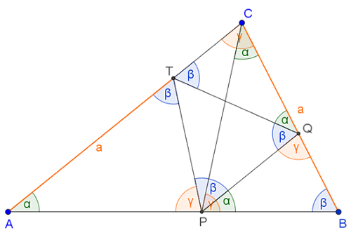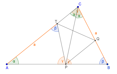 A \(\displaystyle CBP\) háromszögben \(\displaystyle CBP∡=β\), a \(\displaystyle PAT\) háromszögben pedig \(\displaystyle PAT∡=α\). Mivel a két háromszög egybevágó, és \(\displaystyle \alpha\neq \beta\), ezért mindkettőnek van \(\displaystyle α\) és \(\displaystyle β\) szöge is, és így a harmadik szögük \(\displaystyle γ\). A \(\displaystyle CBP\) háromszögben a \(\displaystyle C\) pontban nem lehet a \(\displaystyle γ\) szög, mert \(\displaystyle PCB∡<γ\), így \(\displaystyle PCB∡=α\), és így az \(\displaystyle a\) oldallal szemközti szög, \(\displaystyle BPC∡=γ\). A vele egybevágó \(\displaystyle PAT\) háromszögben az \(\displaystyle a\) oldallal szemközti szög, \(\displaystyle APT∡=γ\).