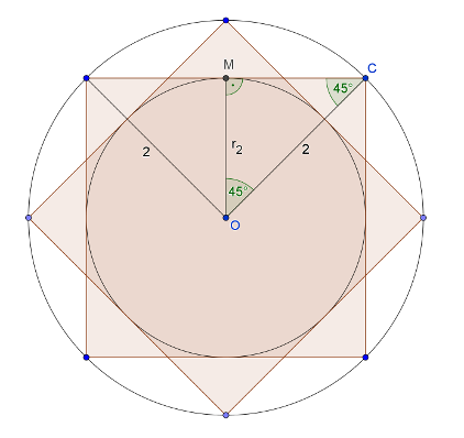 C. 1481. Egy \(\displaystyle 2\) sugarú körbe írt szabályos nyolcszög csúcsait három különböző módon kötjük össze az ábra szerint: minden szomszédos, minden másodszomszédos, majd minden harmadszomszédos csúcsot. Igazoljuk, hogy a három beírt kör sugarának szorzata \(\displaystyle 2\).