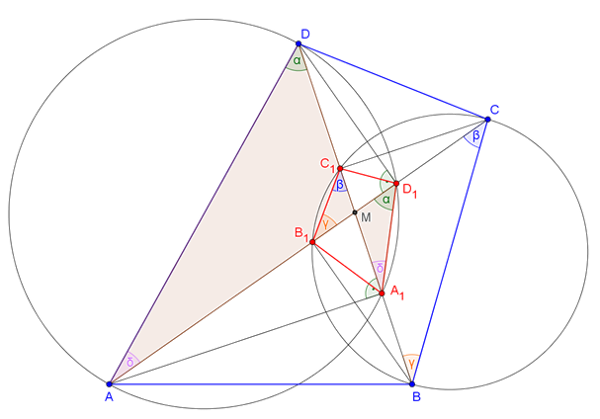 Az \(\displaystyle AA_1D\) és \(\displaystyle AD_1D\) derékszögű háromszögek, ezért a Thalész-tétel miatt az \(\displaystyle AA_1D_1D\) négyszög húrnégyszög. A köré írt körben \(\displaystyle ADA_1∡=AD_1A_1∡=α\), azonos ívhez tartozó kerületi szögek. Hasonlóan \(\displaystyle DAD_1∡=DA_1D_1∡=δ\). Ugyanígy belátható, hogy a \(\displaystyle BB_1C_1C\) négyszög is húrnégyszög és \(\displaystyle CBC_1∡=CB_1C_1∡=γ\) és \(\displaystyle BCB_1∡=BC_1B_1∡=β\). \(\displaystyle AMDΔ≅A_1MD_1Δ\), mert mindhárom szögük egyenlő. Hasonlóan igaz, hogy \(\displaystyle BMCΔ≅B_1MC_1Δ\).