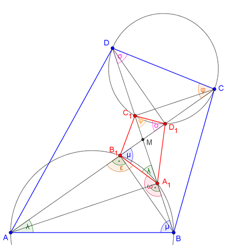 Az \(\displaystyle AA_1B\) és \(\displaystyle AB_1B\) derékszögű háromszögek, ezért a Thalész-tétel miatt az \(\displaystyle ABA_1B_1\) négyszög húrnégyszög. \(\displaystyle ABA_1∡+AB_1A_1∡=180°\), mert a húrnégyszög szemközti szögei. \(\displaystyle MB_1A_1∡+AB_1A_1∡=180°\), mert kiegészítő szögek. Ezért \(\displaystyle ABA_1∡=MB_1A_1∡=μ\). Hasonlóan belátható, hogy \(\displaystyle BAB_1∡=MA_1B_1∡=λ\). Ugyanígy belátható, hogy a \(\displaystyle CD_1C_1D\) négyszög is húrnégyszög és \(\displaystyle DCD_1∡=MC_1D_1∡=φ\), valamint \(\displaystyle CDC_1∡=MD_1C_1∡=σ\). \(\displaystyle AMBΔ≅A_1MB_1Δ\), mert mindhárom szögük egyenlő. Hasonlóan igaz, hogy \(\displaystyle CMDΔ≅C_1MD_1Δ\).