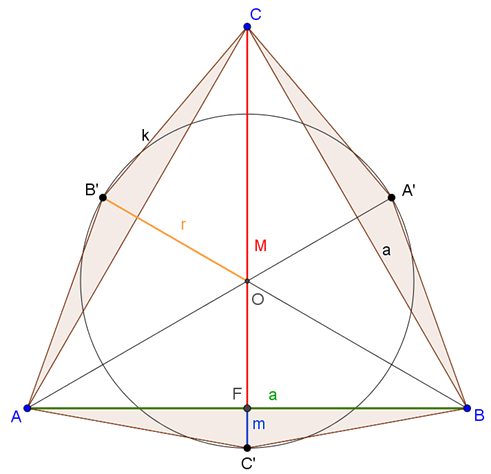 \(\displaystyle m=r-\frac M3=a\cdot\left(\sqrt{\frac{\sqrt{3}}{4π}}-\frac{\sqrt3}{6}\right),\)