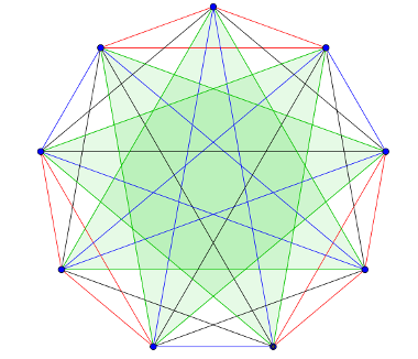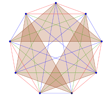Ha a \(\displaystyle 36\) élből ki tudunk alakítani \(\displaystyle 12\) olyan háromszöget, melyeknek nincs közös oldala, akkor a legkevesebb gyakorlattal oldottuk meg, hogy bármely két színész szerepeljen közösen.