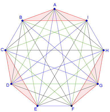 Megoldás. Szemléltessük a feladatot egy kilencpontú gráffal, melynek csúcsai az egyes színészek. Ha két színész együtt szerepel, akkor a pontok össze vannak kötve egy éllel. A háromfős helyzetgyakorlatokat egy-egy háromszög szemlélteti a gráfban.