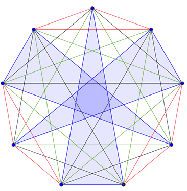 Ha egy csúcs része egy háromszögnek, akkor a csúcsból induló két éllel kapcsolódik a háromszöghöz. Minden csúcsból \(\displaystyle 8\) él indul, tehát minden csúcs \(\displaystyle 4\) háromszöghöz fog kapcsolódni. Vagyis minden színész \(\displaystyle 4\) gyakorlatban fog részt venni és ezekben \(\displaystyle 4\cdot2=8\) különböző színésszel játszik együtt, tehát minden színésszel szerepel közösen. A háromszögek egy lehetséges kialakítását a lenti ábrák mutatják.