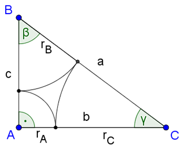 A körök sugarai: \(\displaystyle r_A=1\) cm, \(\displaystyle r_B=2\) cm, \(\displaystyle r_C=3\) cm. A háromszög oldalai tehát: \(\displaystyle a=2+3=5\) cm, \(\displaystyle b=1+3=4\) cm, \(\displaystyle c=1+2=3\) cm. A háromszög derékszögű, mivel \(\displaystyle 5^2=4^2+3^2\).