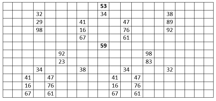 Az \(\displaystyle 5\)-ös számjegy nem szerepel ezekben a számokban, és nem lehet egy kétjegyű prím második számjegye, így csak az első vagy utolsó számjegy lehet az összes szám között is. A szimmetria miatt azonban feltehetjük, hogy az első számjegy lesz. Az \(\displaystyle 5\)-ös számjegyet tartalmazó kétjegyű prímszámok az \(\displaystyle 53\) és az \(\displaystyle 59\). Ha \(\displaystyle 53\)-mal kezdjük a számot, akkor háromféleképpen folytathatjuk. Mindig a következő sorba írjuk a lehetséges folytatást. Látható, hogy nem tudunk minden számjegyet felhasználni, mert ismétlődnének a számjegyek. Ugyanezt kapjuk akkor, ha végignézzük az eseteket az \(\displaystyle 59\)-cel elkezdve.