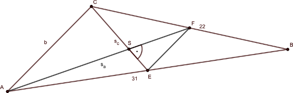 Legyen \(\displaystyle AB=31\) és \(\displaystyle CB=22\) a két megadott hosszúságú oldal. Legyen \(\displaystyle AB\) oldal felezőpontja \(\displaystyle E\), \(\displaystyle BC\)-é \(\displaystyle F\). Húzzuk be az \(\displaystyle EF\) középvonalat, majd írjuk fel a Pitagorasz-tételt a következő négy (\(\displaystyle S\)-nél) derékszögű háromszögre: \(\displaystyle AES\), \(\displaystyle FCS\), \(\displaystyle CAS\) és \(\displaystyle EFS\). Ezekből rendre kapjuk, hogy