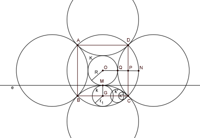 Másrészt olyan körből, ami egy tükörképet és a körülírt kört is belülről érinti végtelen sok van, például az ábrán \(\displaystyle k, k^{'} \text{ és } k^{''}\). Ezek területét jelölje rendre \(\displaystyle t, t^{'} \text{ és } t^{''}\). Ahhoz, hogy \(\displaystyle \frac{T}{t}\) lehetséges legkisebb értékét meghatározzuk, meg kell határozni \(\displaystyle t\) lehető legnagyobb értékét, hiszen \(\displaystyle T\) fix. Megmutatjuk, hogy a \(\displaystyle k\) kör területe a legnagyobb (természetesen szimmetria okokból 4 db ugyanekkora sugarú kör van, mindegyik tükörképhez tartozik egy). Ez pedig az a kör, ami a \(\displaystyle K\) kört ugyanabban az \(\displaystyle M\) pontban érinti, mint a tükörkép kör. Ehhez megmutatjuk, hogy a \(\displaystyle k\) kör sugara (\(\displaystyle r\)) a legnagyobb. Húzzuk be \(\displaystyle k\)-hoz \(\displaystyle M\)-ben az \(\displaystyle e\) érintőt. Ez párhuzamos a négyzet \(\displaystyle BC\) oldalával, valamint a tükörkép körnek is érintője. Mivel az érintőnek pontosan egy közös pontja van a körrel és az összes többi pontja külső pont, így \(\displaystyle e\)-nek nem lesz közös pontja a többi (\(\displaystyle k^{'}, k^{''}, \dots\)) körrel. Továbbá mivel az összes \(\displaystyle k\) kör középpontja \(\displaystyle BC\)-n, a közös húron van, így azok sugara biztosan kisebb \(\displaystyle r\)-nél.