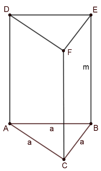 Megoldás. A hasábunk alap- és fedőlapja egy-egy szabályos háromszög. Legyen ennek az oldala \(\displaystyle a\). Ekkor a háromszög területe: \(\displaystyle \frac{\sqrt{3}}{4}a^2\). A hasáb magassága (azaz az oldallapok egyik oldala) legyen \(\displaystyle m\).