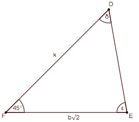 Mivel \(\displaystyle k =a+b+\sqrt{a^2+b^2}> b \sqrt{2}\), ezért \(\displaystyle \epsilon >\delta\), azaz \(\displaystyle \delta \)-t elég meghatározni. Valamint jegyezzük meg, hogy \(\displaystyle \epsilon = 135^{\circ} - \delta\). Most írjuk fel a szinusztételt a \(\displaystyle DEF\) háromszögben: