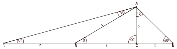 Ekkor az \(\displaystyle ACE\) háromszög derékszögű és egyenlő szárú, így a másik két szöge \(\displaystyle 45^{\circ}\)-os, az átfogója pedig \(\displaystyle b \sqrt2\) a Pitagorasz-tételből. Másrészt \(\displaystyle DE=k\), azaz az \(\displaystyle ADE\) háromszög pont olyan, hogy a \(\displaystyle 45^\circ\)-os szögének szárain levő oldalainak hossza \(\displaystyle k\) és \(\displaystyle b\cdot\sqrt{2}\). (Ez a három adat egybevágóság erejéig meghatározza már a háromszöget.) Már csak ennek a háromszögnek kell meghatározni a legkisebb szögét. Az \(\displaystyle ADB\) háromszög egyenlő szárú, két alapon fekvő szöge \(\displaystyle \beta/2\), mivel ezek összege egyenlő a harmadik csúcsnál lévő külső szöggel, ami \(\displaystyle \beta\). Az \(\displaystyle ADE\) háromszög \(\displaystyle A\) csúcsnál levő szöge biztosan a legnagyobb, hisz nagyobb, mint \(\displaystyle 45^\circ + \beta/2\), míg a másik két szög \(\displaystyle 45^\circ\), illetve \(\displaystyle \beta/2\). Továbbá mivel \(\displaystyle \beta\) egy derékszögű háromszög nem derékszöge, így \(\displaystyle \beta < 90^{\circ}\), azaz \(\displaystyle \frac{\beta}{2} < 45^{\circ}\).