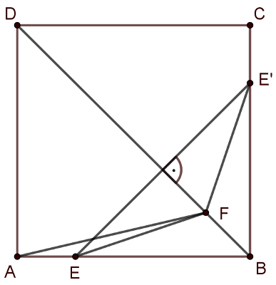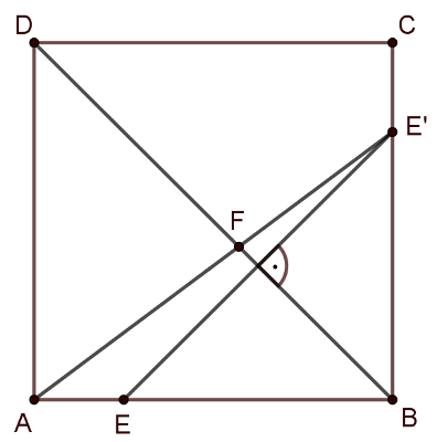 Először tükrözzük az \(\displaystyle E\) pontot a négyzet \(\displaystyle BD\) átlójára, képe legyen \(\displaystyle E'\). Ekkor \(\displaystyle E'\) rajta lesz a \(\displaystyle BC\) oldalon (a \(\displaystyle C\)-hez közelebbi negyedelőpont lesz) és \(\displaystyle FE=FE'\) (a tengelyes tükrözés tulajdonságai miatt), azaz a feledattal ekvivalens \(\displaystyle AF+E'F\) összeg minimumát keresni.