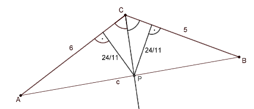 C. 1556. Az \(\displaystyle ABC\) háromszög \(\displaystyle C\) csúcsából induló belső szögfelező a szemközti oldalt a \(\displaystyle P\) pontban metszi. A \(\displaystyle P\) pont távolsága az oldalaktól \(\displaystyle \frac{24}{11}\), továbbá \(\displaystyle AC=6\) és \(\displaystyle BC=5\). Határozzuk meg az \(\displaystyle AB\) oldal hosszát.