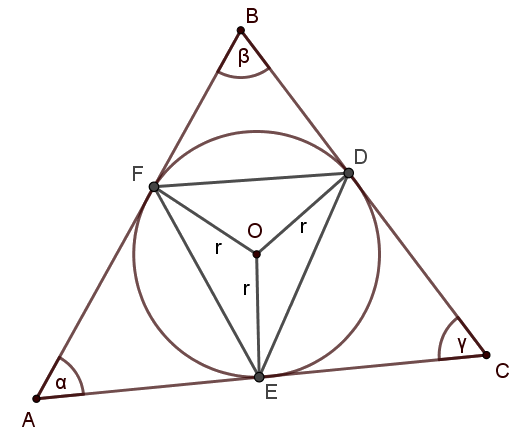 Először jegyezzük meg, hogy \(\displaystyle OFB \angle = ODB \angle= 90^\circ\), mert egy körhöz húzott külső érintő merőleges az érintési pontba húzott sugárra. Ekkor az \(\displaystyle ODBF\) négyszöget nézve kapjuk, hogy \(\displaystyle FOD \angle= 360^\circ - 2 \cdot 90^\circ- \beta = \alpha + \gamma.\) Mivel az \(\displaystyle OFD\) háromszög egyenlőszárú (két oldala sugár a beírt körben), így \(\displaystyle OFD \angle= ODF \angle = (180^\circ - (\alpha + \gamma))/2= \beta/2.\) Hasonlóan belátható, hogy az \(\displaystyle EFO\), illetve \(\displaystyle EDO\) egyenlőszárú háromszögek szárszögei rendre \(\displaystyle \alpha/2\), illetve \(\displaystyle \gamma/2\). Vagyis azt kaptuk, hogy az \(\displaystyle FED\) háromszög szögei \(\displaystyle \alpha/2+ \beta/2, \alpha/2+ \gamma/2, \beta/2+ \gamma/2\).