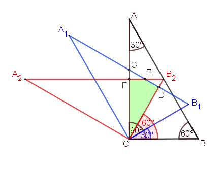 Megoldás. Legyen a félszabályos háromszögünk átfogója 1 egység. Ekkor a hosszabbik befogó, \(\displaystyle AC\) hossza \(\displaystyle \frac{\sqrt3}{2}\). A feladat szövege alapján forgassuk el az \(\displaystyle ABC\) félszabályos háromszöget a derékszögű \(\displaystyle C\) csúcsa körül először \(\displaystyle 30^\circ\)-kal, ekkor kapjuk az \(\displaystyle A_1B_1C\) háromszöget, majd az újbóli \(\displaystyle 30^\circ\)-kal való elforgatással kapott háromszög legyen \(\displaystyle A_2B_2C\). Itt jegyezzük meg, hogy a háromszög körüljárása nem befolyásolja a megoldást, \(\displaystyle A, B\) fordított elhelyezkedésekor ugyanígy helyezkednek el az elforgatott háromszögek egymáshoz viszonyítva (tengelyes szimmetria alapján).