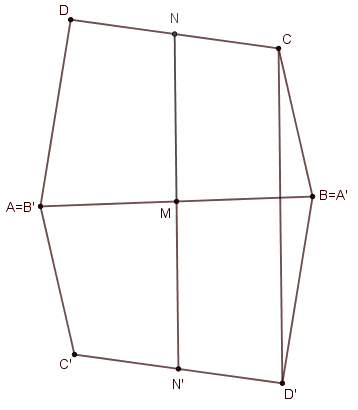 Másrészről \(\displaystyle NN'=2 \cdot MN = BC+AD\). Így \(\displaystyle CD'=NN'=BC+AD\). Továbbá \(\displaystyle AD=A'D'(=BD')\) a középpontos tükrözés tulajdonságai miatt. Így a \(\displaystyle CD'B\) háromszögben két oldal összege pont a harmadik oldal (\(\displaystyle CD'=BC+BD'\)), azaz ez egy elfajuló háromszög, \(\displaystyle B\) rajta van \(\displaystyle CD'\) egyenesen. Emiatt \(\displaystyle CB \parallel MN\).