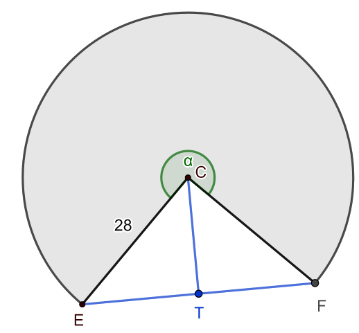 \(\displaystyle TC= 28\cos(ECT\sphericalangle)=28\cos\left(\frac{ECF\sphericalangle}{2}\right)= 28\cos45^{\circ} \approx 19,8.\)
