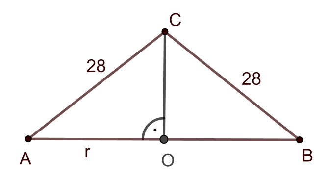 Nézzük az \(\displaystyle AOC\) háromszöget: ez egy derékszögű háromszög, \(\displaystyle C\)-nél levő szögének nagysága a kúp nyílásszögének fele (\(\displaystyle 48,59^{\circ}\)), az \(\displaystyle AC\) átfogó hossza 28 cm. Ebből