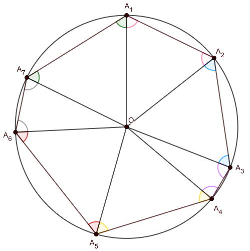 Megoldás. Kössük össze a hétszög csúcsait a kör \(\displaystyle O\) középpontjával. Ekkor keletkezik 7 háromszög az ábrán látható módon. Ezen háromszögek mindegyike egyenlő szárú, hisz bármelyik háromszögnek két oldala a körnek sugara.