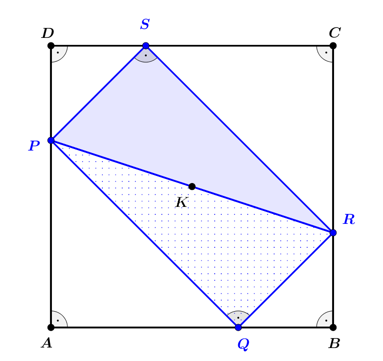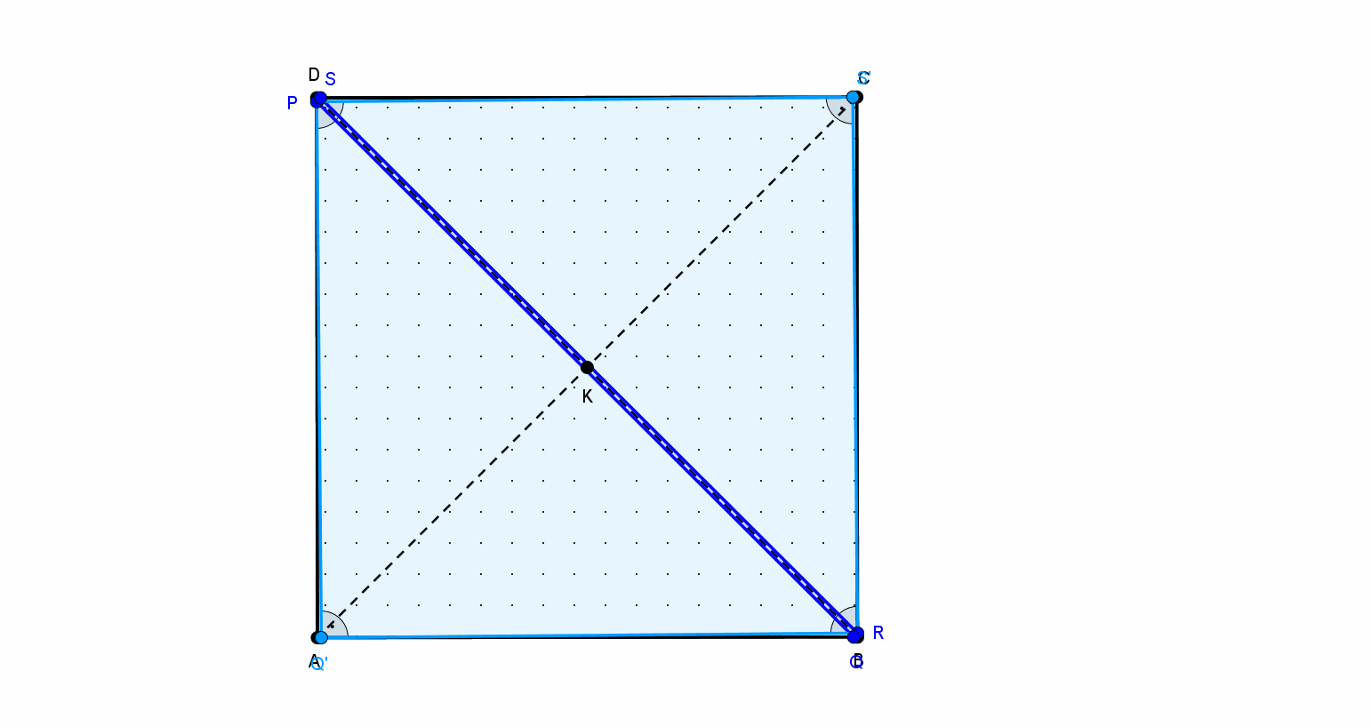 Ha \(\displaystyle PQRS\) paralelogramma, akkor \(\displaystyle SP||RQ\) és egyenlő hosszúak. A párhuzamosság miatt \(\displaystyle QRB\sphericalangle=SPD\sphericalangle\), mert váltószögek. Tehát a \(\displaystyle QRB\) és az \(\displaystyle SPD\) derékszögű háromszögek szögei és átfogójuk hossza megegyezik, vagyis a két háromszög egybevágó. Mivel \(\displaystyle PD\) és \(\displaystyle RB\), illetve \(\displaystyle SD\) és \(\displaystyle QB\) középpontosan szimmetrikus a négyzet \(\displaystyle K\) középpontjára, így a két háromszög, és így a paralelogramma is az.